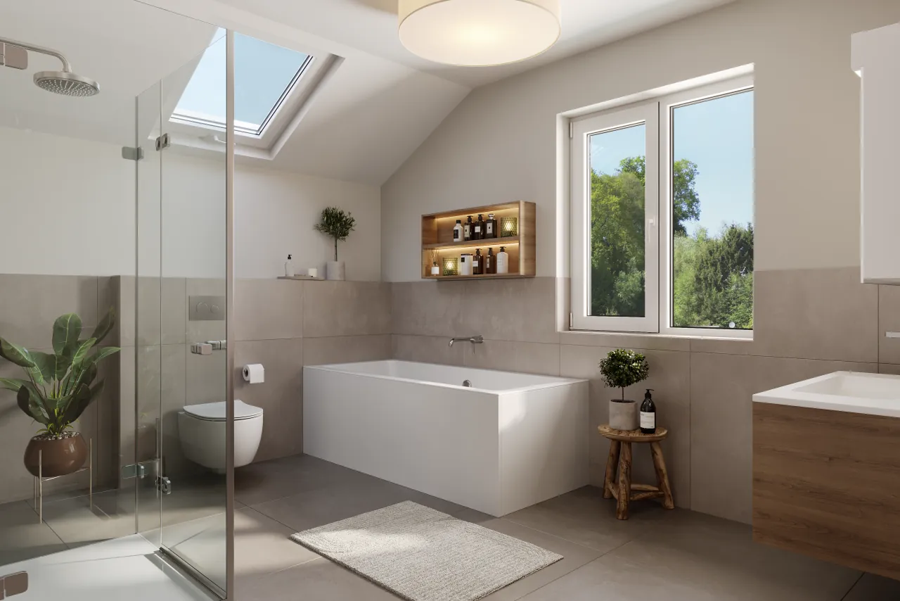 Ausstattung wie Böden, Sanitär und Innentüren können individuell gewählt werden. Eigenleistungen bieten zusätzliches Einsparpotential, individuelle Anpassungen sind gegen Aufpreis möglich.
